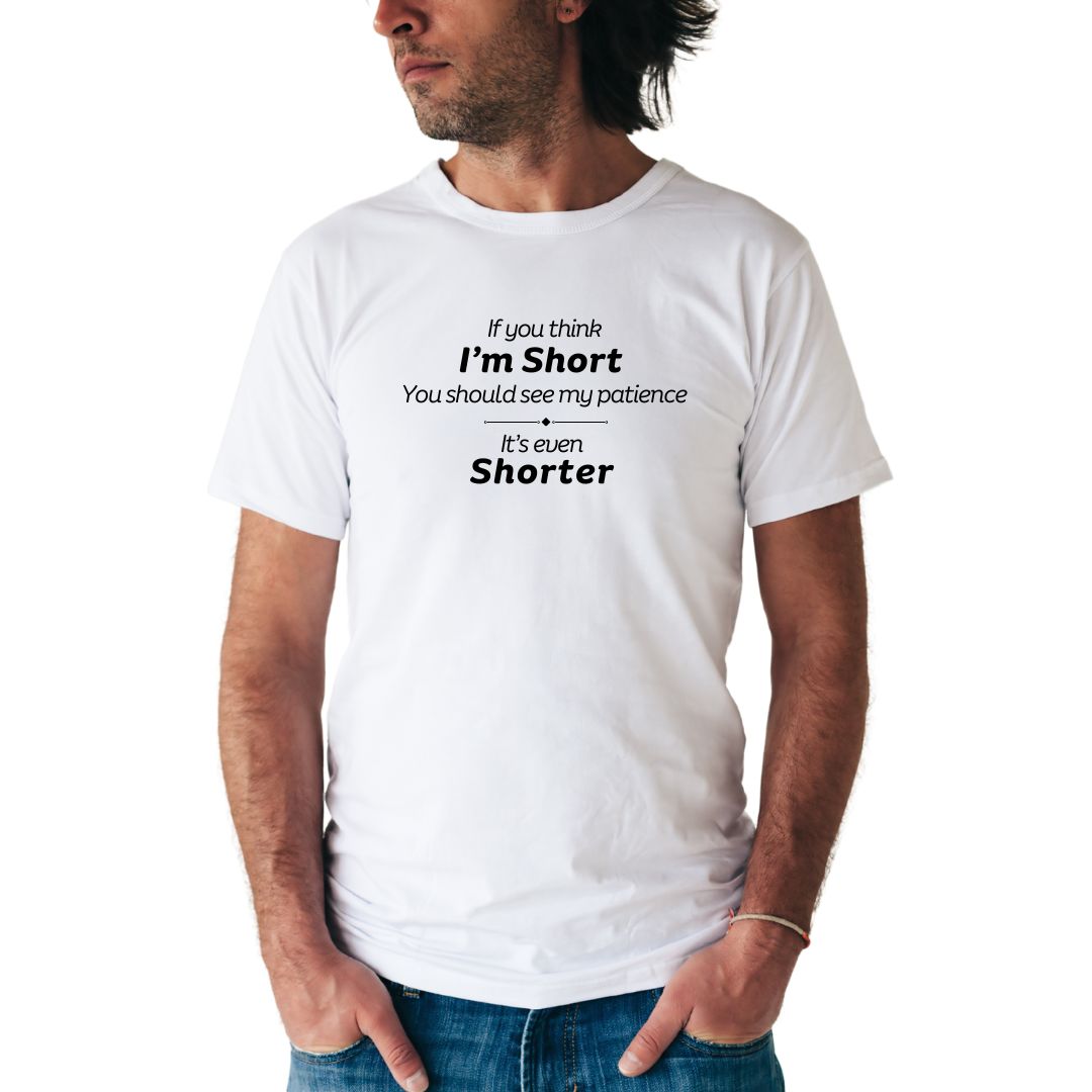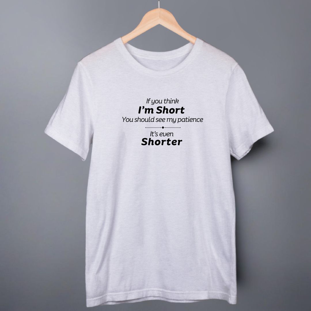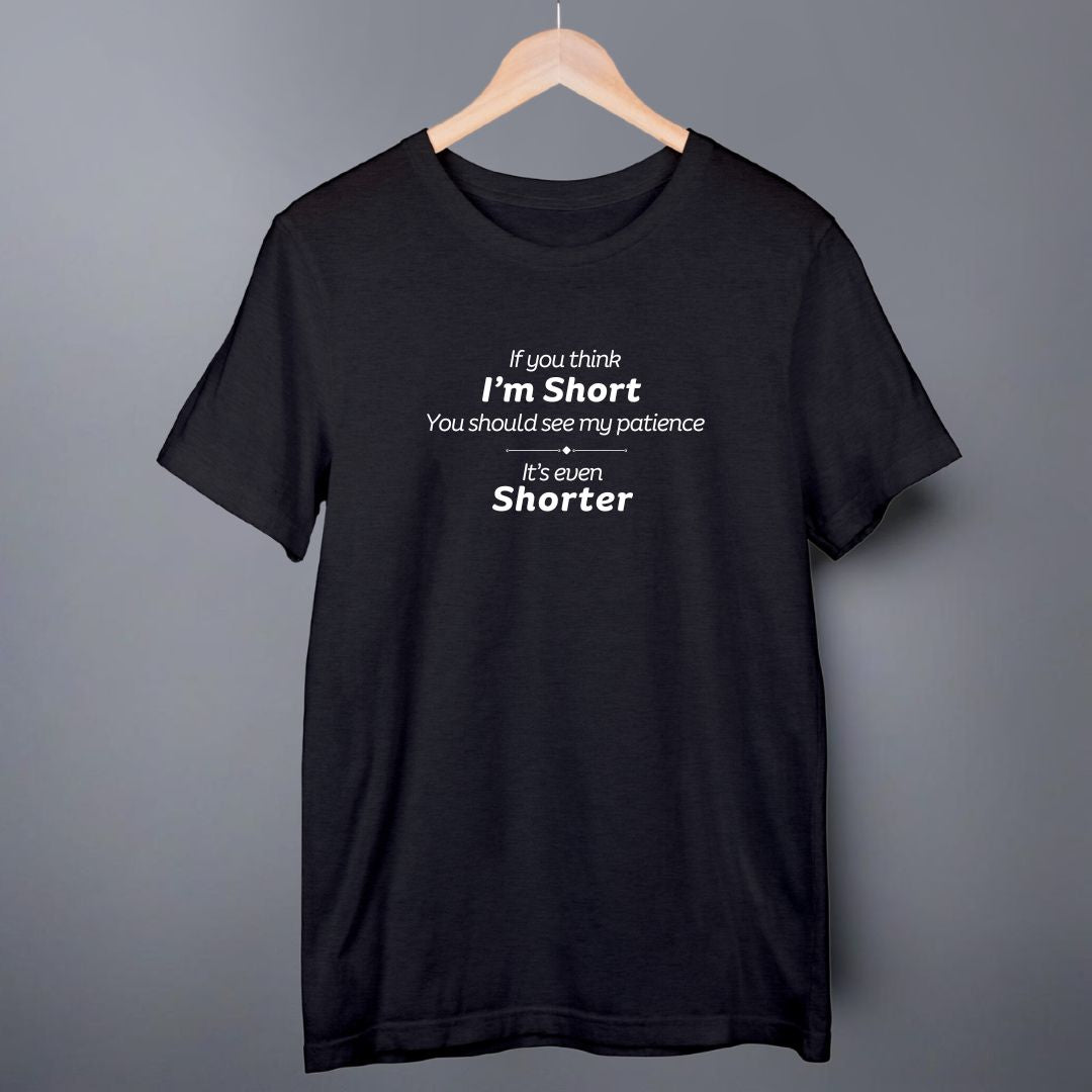 Show off your sense of humor with our "If You Think I'm Short, You Should See My Patience" T-shirt. Perfect for those who love witty and relatable quotes, this tee is made from premium, soft fabric for all-day comfort. Ideal for casual outings, lounging at home, or as a fun conversation starter, this T-shirt is a playful way to express your personality and keep things light-hearted.