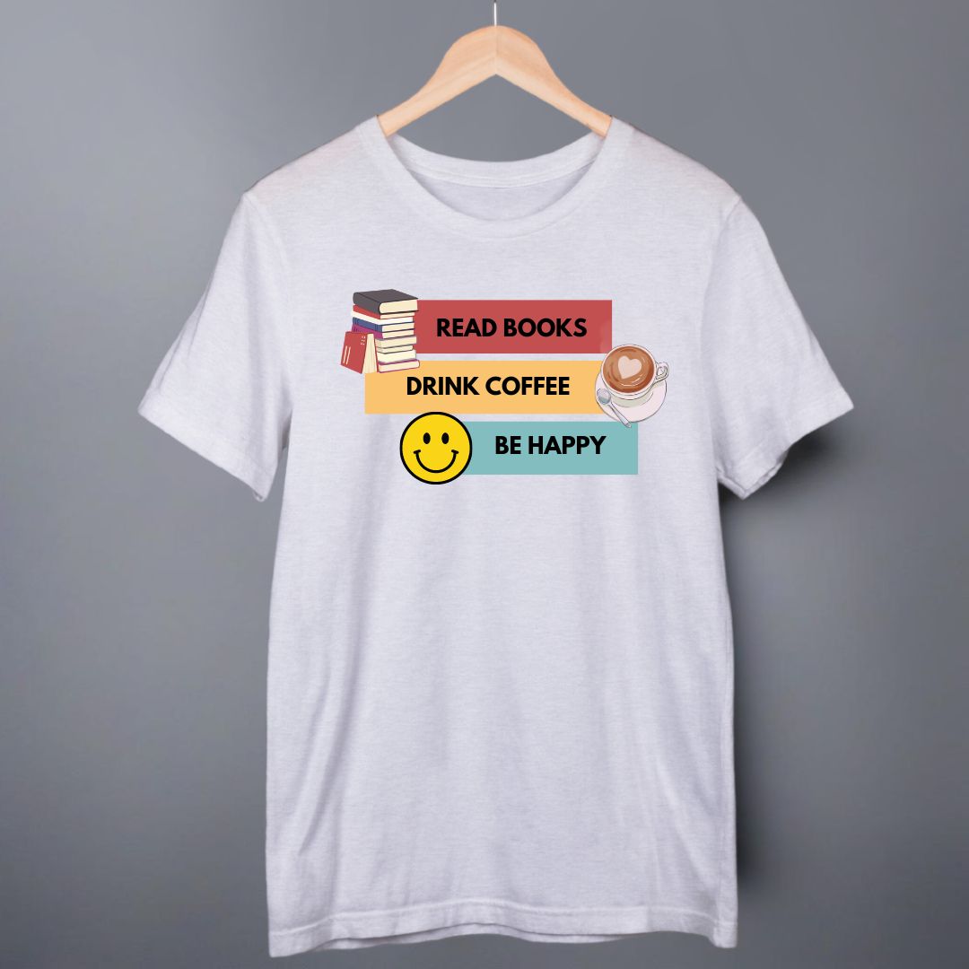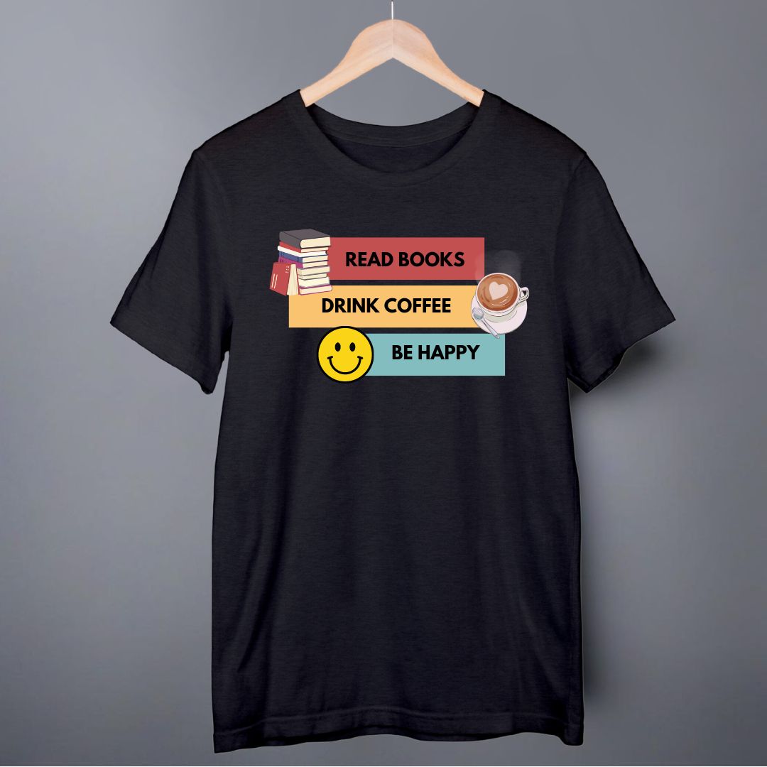 Indulge in the simple joys of life with our T-shirt, reminding you to read books, drink coffee, and be happy. Find bliss in the perfect combination of literature and a warm cup of coffee.