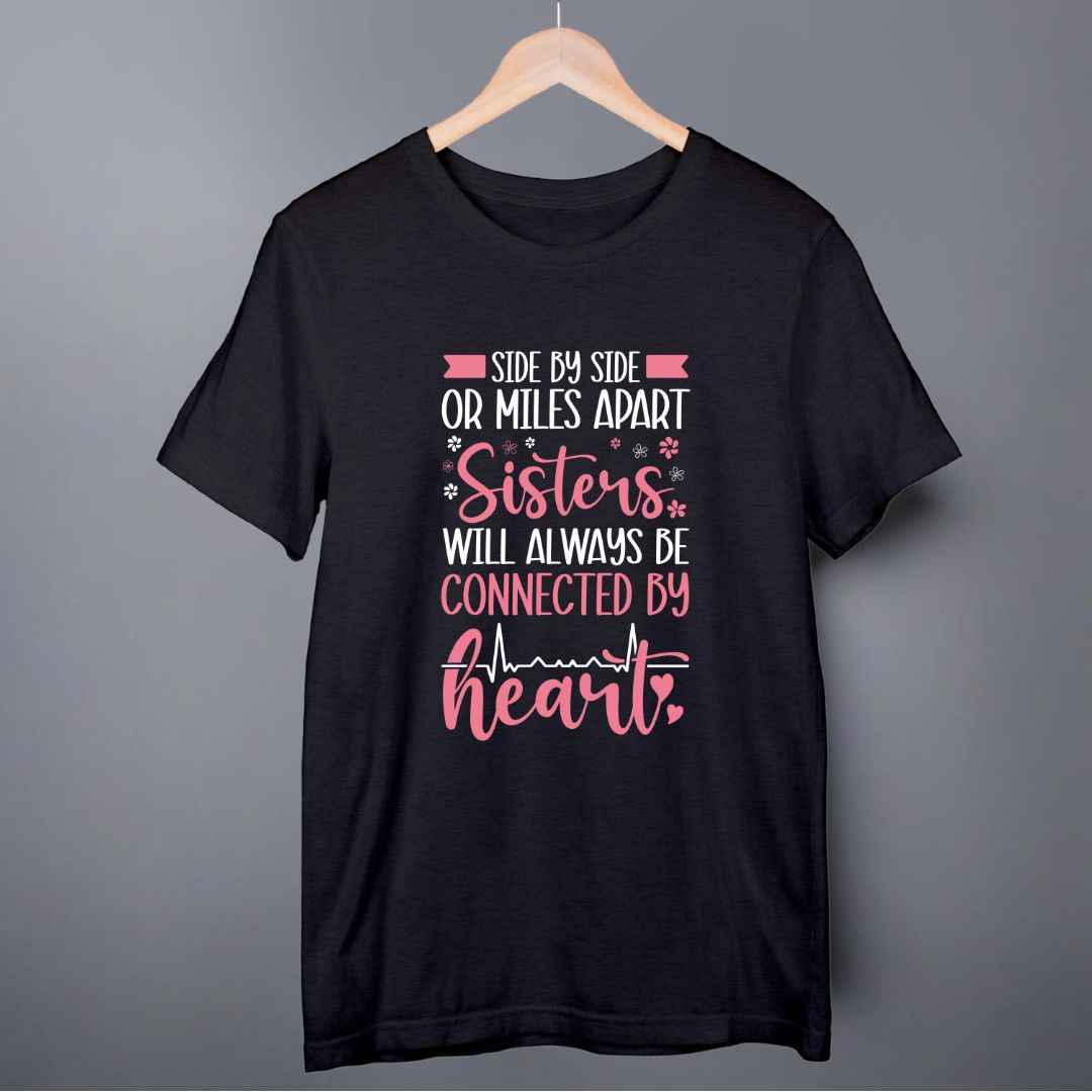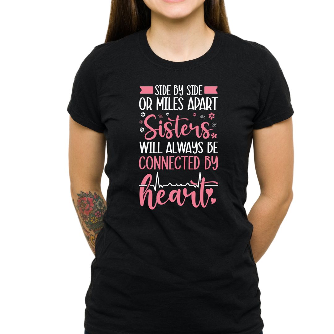 Capture the timeless bond of sisterhood with our heartfelt T-shirt, symbolizing that whether side by side or miles apart, sisters are forever connected by hearts. Celebrate the unbreakable bond of sisterly love.